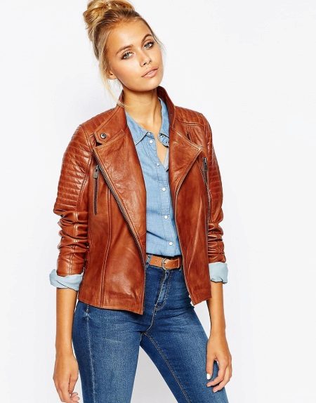 The combination of leather jackets with feminine outfits looks very impressive - romantic dresses, skirts and high-heeled shoes. Accessories can be very different - from leather bracelets with metal studs to bright baubles and cozy knitted scarves.