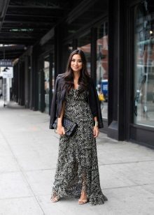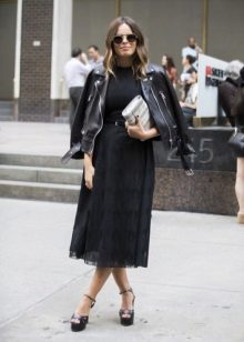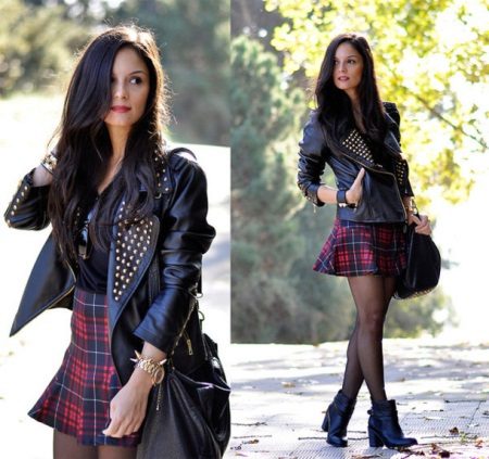 A leather jacket with an abundance of rivets matches the grunge style. But she will fit perfectly in the evening bow in combination with a long dress.