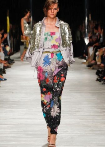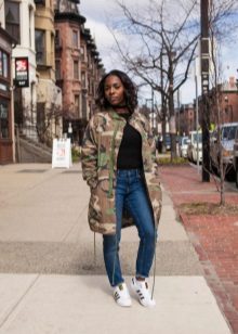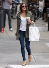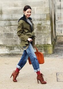 The park looks good with a skinny, and with boyfriends, and flared jeans, but the combination with jeans trimmed with embroidery, rhinestones or similar bright decor is considered not very successful.