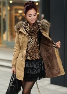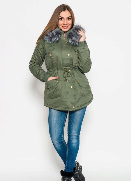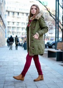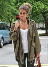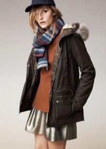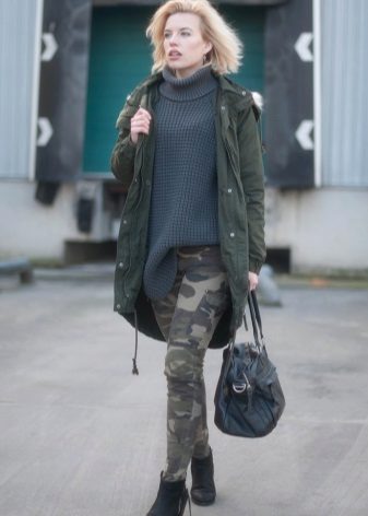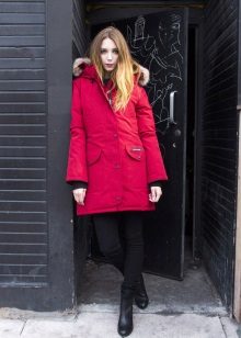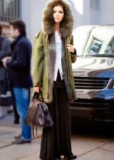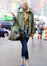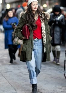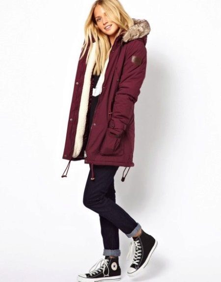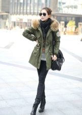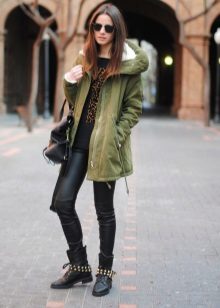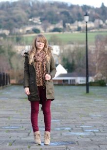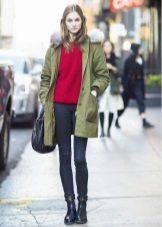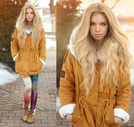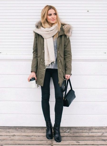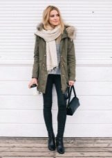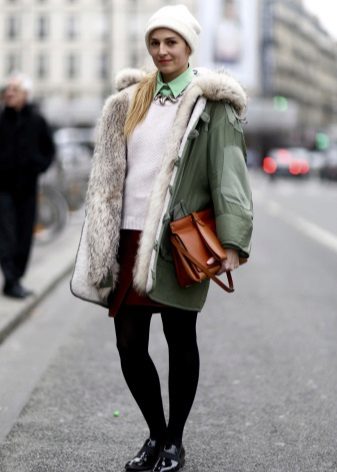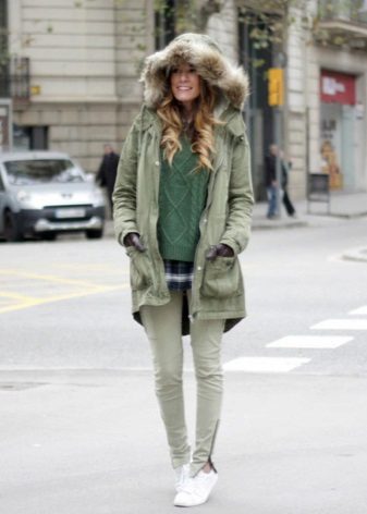 In addition to jeans, the parka is often worn with tight-fitting and skinny trousers. Also, such a jacket looks good with skirts, the length of which is selected taking into account the length of the parka. The longer the jacket, the shorter the skirt can be.