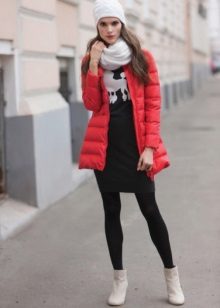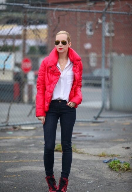 A bright red down jacket will be an accent in any look. And in combination with the classic combination of "white top-black bottom" it looks very vibrant and stylish. High tank sneakers complement this trendy casual look.