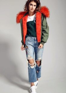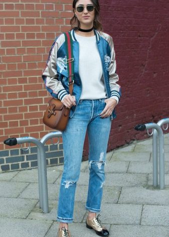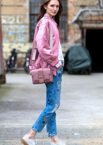 - With jeans, a bomber jacket looks youthful and relaxed. Jeans are allowed almost any - skinny, pipes, straight or boyfriends. Casual style is, first of all, comfort and convenience. Therefore, we add cozy uggs or laconic shoes with flat soles to the jeans.