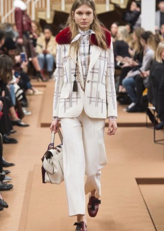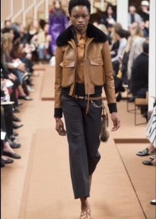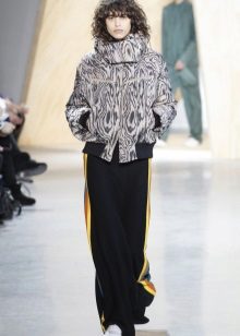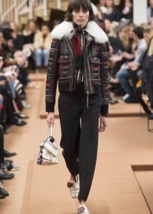 - Straight trousers and a bomber jacket create a casual ensemble. In it you can go to work and for a walk. Flashy accessories will help to add brightness to the image.