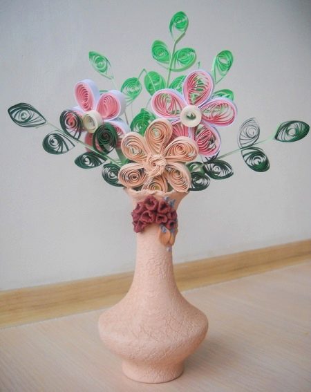 - In a high pastel shade vase, you can place neat quilling flowers in pink, beige, white colors.It is worth supplementing them with long "branches" with leaves of a light green and dark green hue.