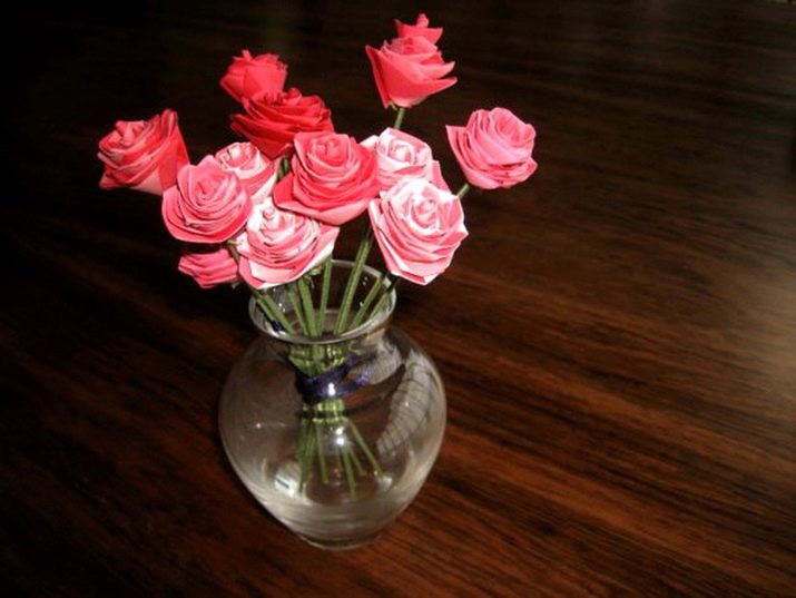 - As mentioned above, some of the easiest to manufacture roses demonstrate their love by many people. You can make a combination of several such flowers of scarlet and pale pink and attach homemade green stems to them. Such a delicate decoration can be placed in a neat glass vase with transparent walls.