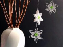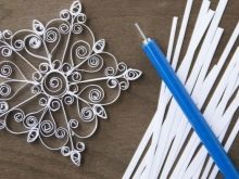 There is another option for how to make a snowflake using the described technique. In the design of such a product, an element such as an “eye” is used. Around one spiral, several eyes are laid out, glued together. At the second stage, a tight spiral is made and glued to the peaks. At first, it is difficult to create a non-spinning spiral, therefore it is advised to shift its center and slightly press it.