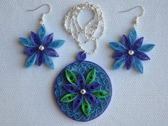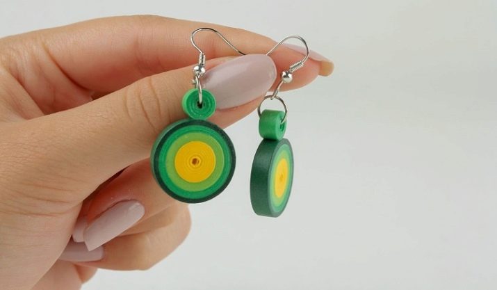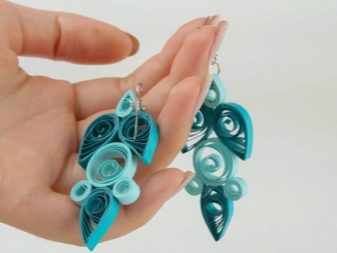 Lastly, several paper strips are cut out and glued, then curled, but not in a tight, but in a free spiral. Then the obtained blank is slightly stretched, and an element in the form of an eye is obtained. There should be four such figures. Two are attached to the previously created template for each earring.