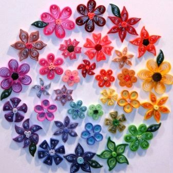 Colors for the quilling technique may be different. Better to start with the simplest. To create such an element, you will first need to make one free roll, it will act as the middle. Four spirals are made for the petals, which slightly dissolve. The diameter depends on the wishes of the master, however, as well as the number of petals.