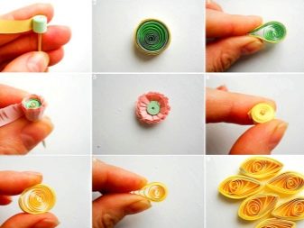 - From pink paper you need to twist a free spiral, squeeze this workpiece from two sides and form a “drop”. The tip of the resulting figure needs to be slightly bent to the side.