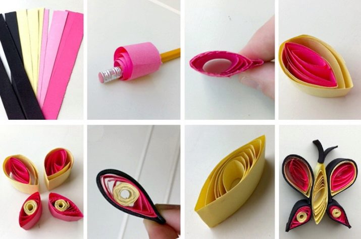 - The final element of the butterfly is the antennae. The strip of black color is bent in half, for each half you only need to wind the tip.