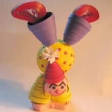 - Stick the hat, all the details to the body.Finish the “face”. Build tight, dark rolls for your eyes. A satin ribbon is suitable for a scarf.