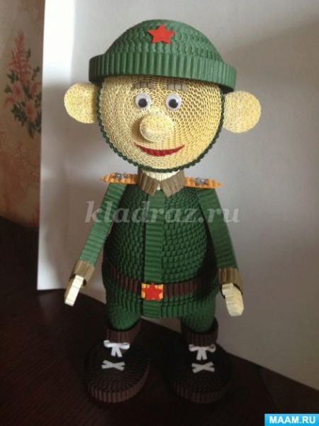 - In this technique, you can make a variety of characters. It may be interesting to get a paper soldier in a military uniform with red stars and epaulets. In the performance of such figures can be quite difficult, so it is better for novice masters to try to make something easier.