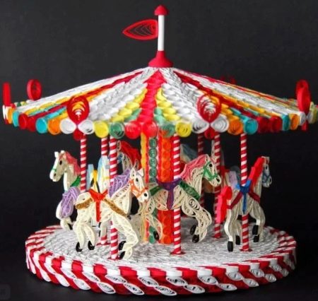 - If you have already mastered the above technique, you can try to make a colorful carousel with snow-white horses with your own hands. For such a vivid and detailed composition, you will need many small rolls that will need to be correctly and accurately positioned in their places.