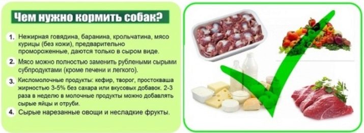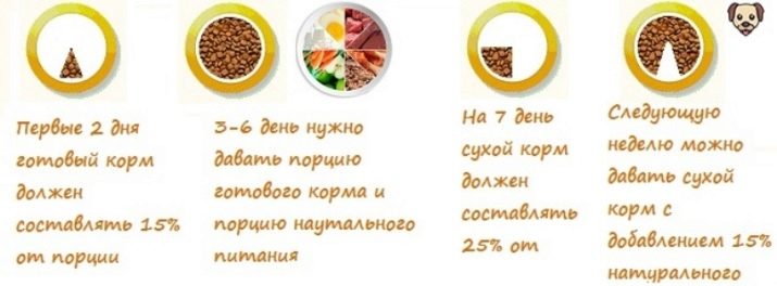 If the owner decided to choose a mixed type of food, then he should know that the puppy should be gradually accustomed to the use of dry food as the main one, first soaking the granules in water. Once a day, the baby receives pieces of lean raw meat.