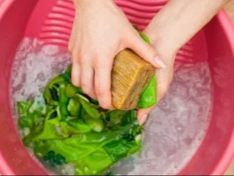 - After this, it is necessary to moisten the thing with water and apply laundry soap to the stain, which must be left for 30 minutes.