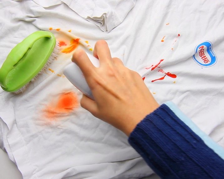 When cleaning colored fabrics, bleach cannot be used, that is, your stain remover should be designed for colored materials. It is better not to use solvents and White Spirit, they can change the color of the treated area, and in the end the thing will be damaged. This is especially true for multi-colored synthetic products.