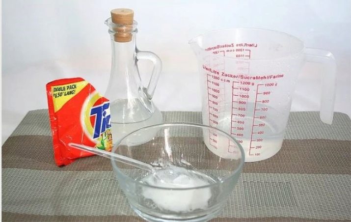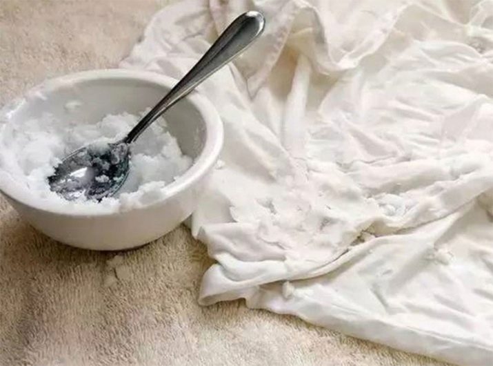 - Mixing soda, salt and soda. The resulting mixture is applied to the stain, and then washed in the usual way.