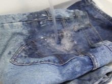 Denim fabrics absorb oil very much, so get rid of the stain as quickly as possible. In this case, you can use chalk, starch or dishwashing detergent.