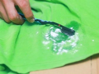 After that, apply baking soda liberally to the contaminated area. Using a soft bristle brush, rub it into the fabric. When it begins to slide into lumps, stop rubbing and remove any remaining soda powder. If the soda remains on the surface, then with the first wash it will be removed without any problems. Oil stains must be treated with dishwashing liquid. At the end of all these manipulations, it will be enough to wash the thing in normal mode.