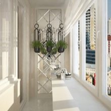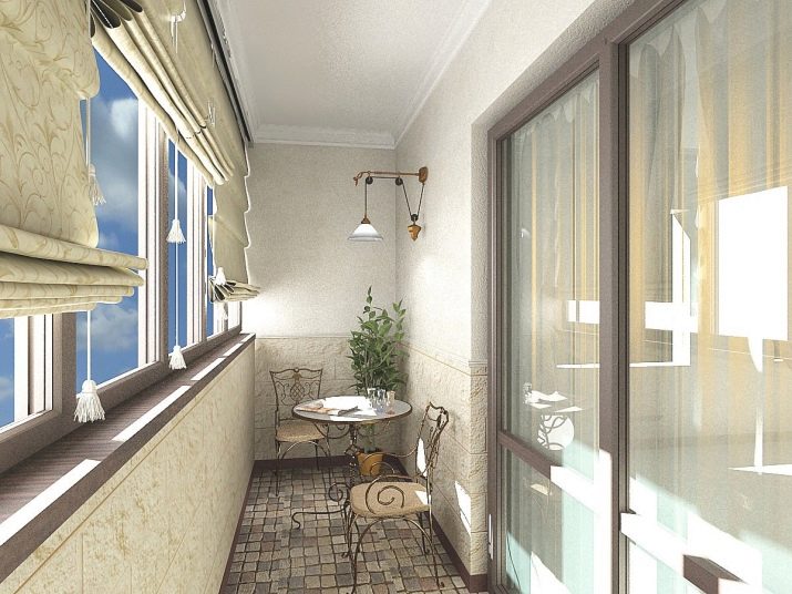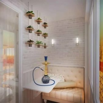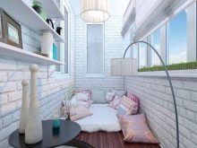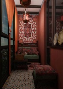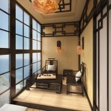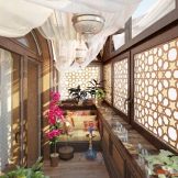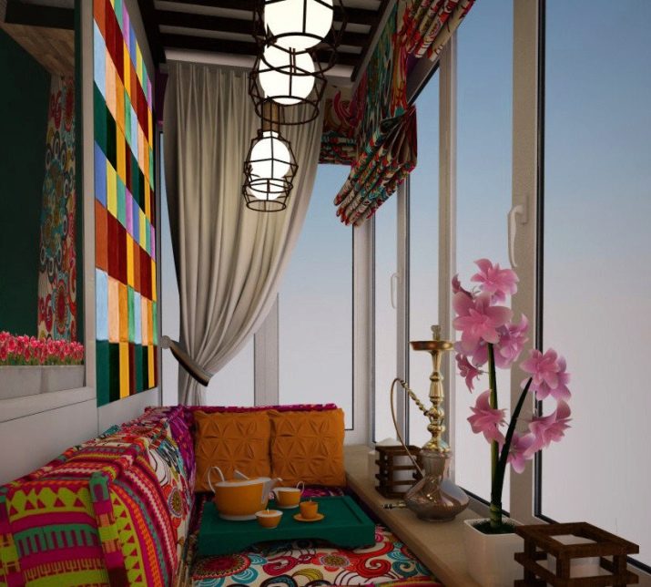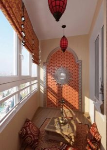 As for furniture, you can purchase small benches, a sofa or chairs. But a more interesting solution is the use of a large number of pillows - they can cover the entire floor of the loggia. An additional decoration of such an interior can be oriental-style chandeliers and lamps, candles and various wall decorations.