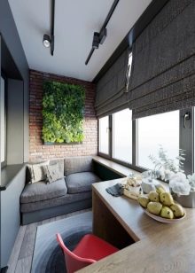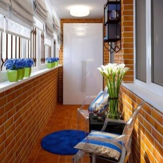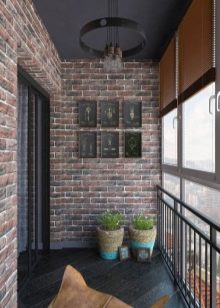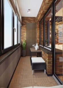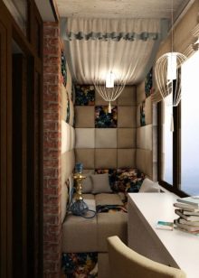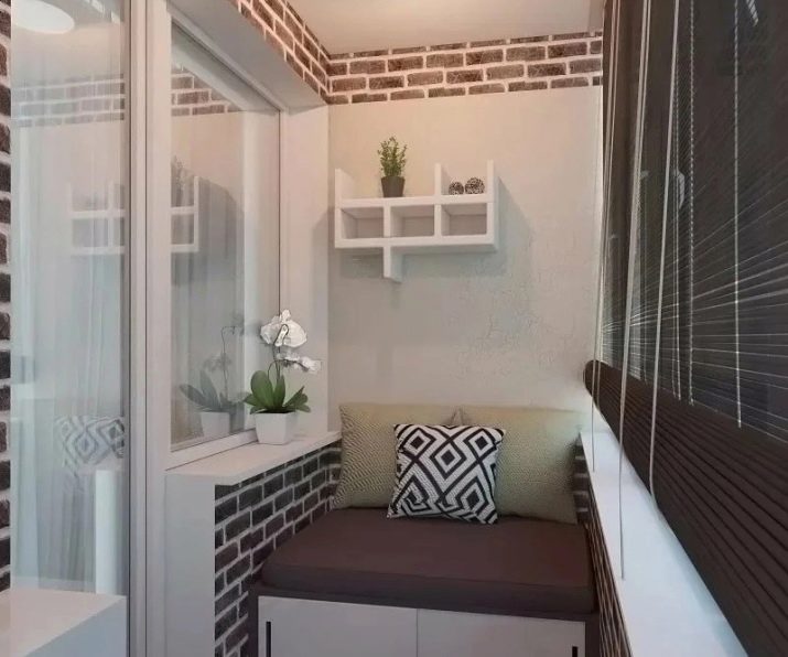 You can create an interesting interior by imitating brickwork. A small sofa is installed in the corner of the loggia, and inside its lower part you can place boxes for storing various little things.