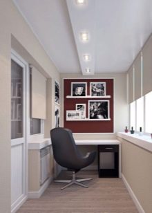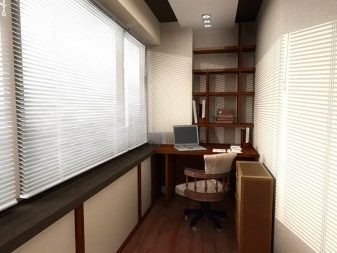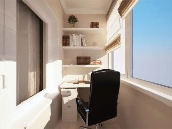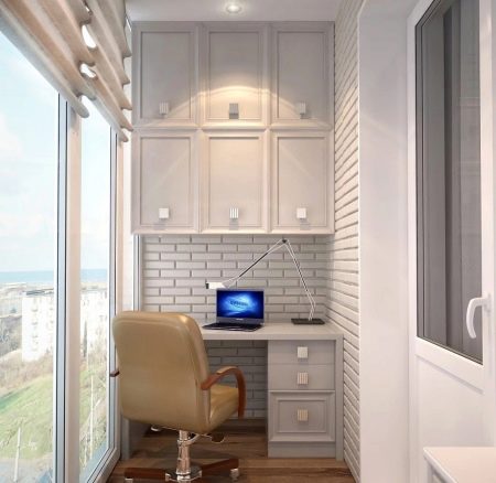 You can make a comfortable, bright and beautiful study from the loggia. The working area is most often located near a narrow wall, and a small cabinet or shelves can be installed both on the opposite side and under the windows along a long wall.
