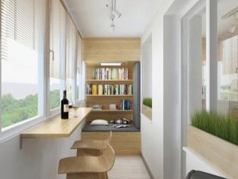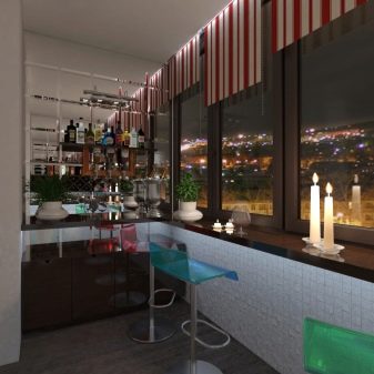 An interesting and unexpected idea is the design of the loggia bar. In such a room you can always retire and go about your business. Moreover, such a loggia will look spacious and large, since the bar and chairs do not take up much space.