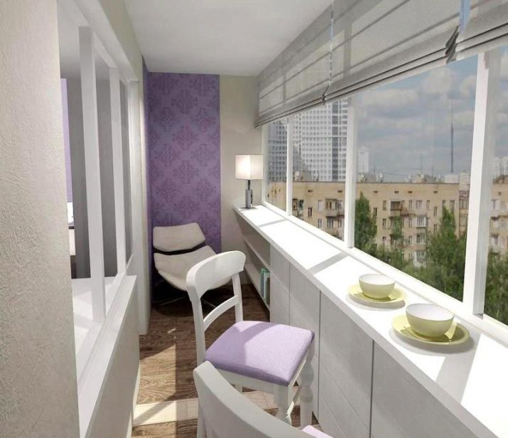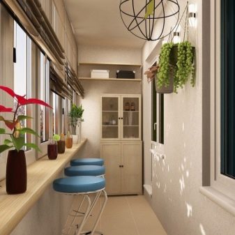 Such a solution is often used in old buildings, for example, in panel houses, since the rooms in them are quite small. Depending on the location of the loggia, it can be a continuation of the kitchen, bedroom or living room. Usually, the window between the loggia and the other room is removed, and a table or shelves are made from the windowsill.