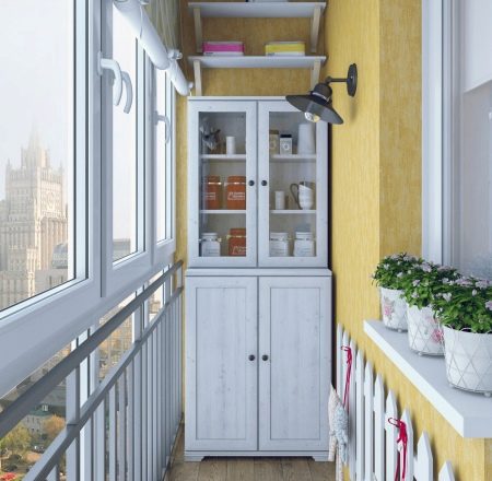 If you decide to equip the loggia for storage, then the interior will look beautiful in yellow and white colors in the Provence style.
