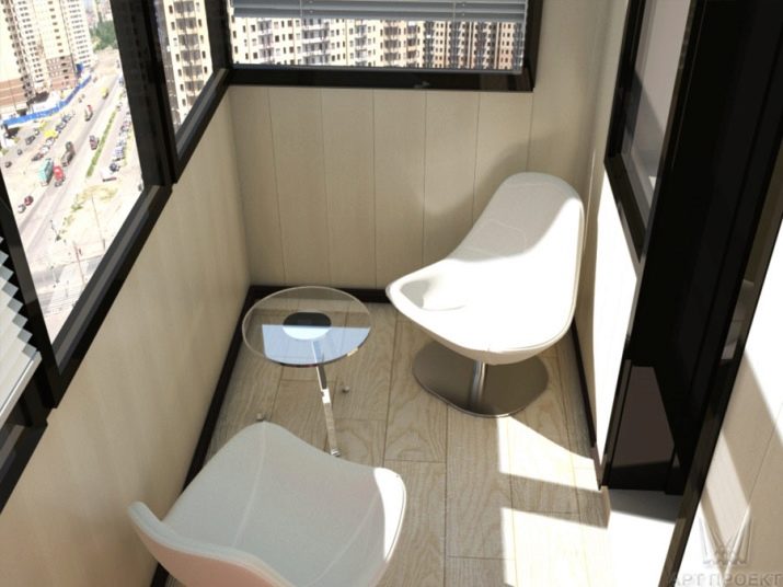 Decorating a small balcony in beige and gray colors will visually increase the space. And in order not to clutter up the room, you should purchase an elegant set of a table and chairs.