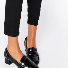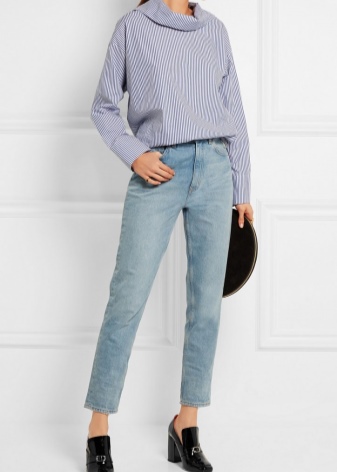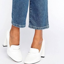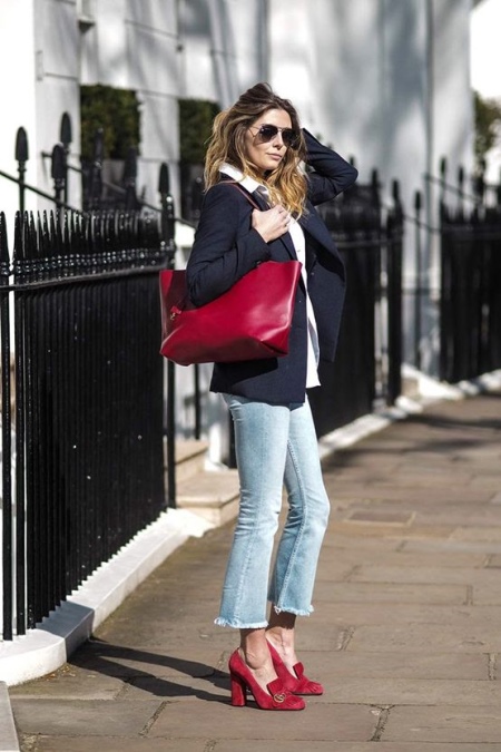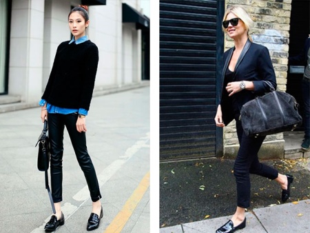 - Heeled loafers look great with trousers and jeans. It can be any models - in the office the classic will be appropriate, skinny or flared suits are suitable for every day, and if you want to produce an unforgettable effect, choose free culottes.