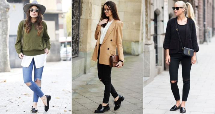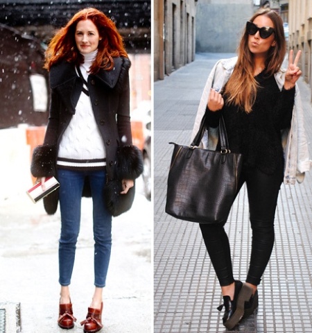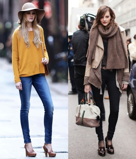 - For everyday outfits, combine heeled loafers with skinny jeans and a loose sweater. Complement the image of a jacket-jacket or coat-oversize. ?