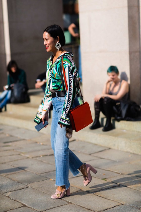 A stylish look for meeting friends or going to the cinema, which easily transforms into an office one and vice versa. Straight-cut blue jeans, a vibrant print shirt, pale pink suede high-heeled loafers, and a bright red tablet handbag. The image is complemented by a wide black belt, red lipstick and massive earrings.