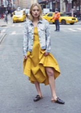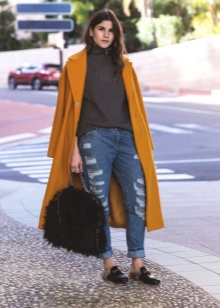 In the cool season, a combination of loafers with fur and knitted dresses is relevant. Here, dense monophonic tights without a pattern are appropriate. The ensemble of a coat and a voluminous scarf will complete.