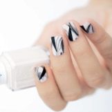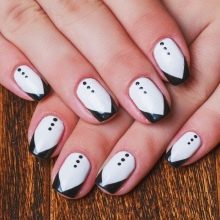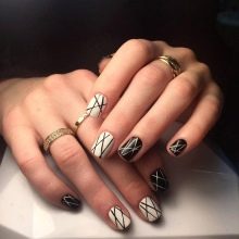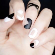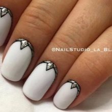 - Contrast and asymmetry. Every day, the use of contrasting scales and asymmetries in manicure is gaining more and more popularity. Making your nails with snow-white manicure, you can safely "play" with shapes and colors. For example, white varnish can be combined with black peas or multi-colored triangles. Design options - a great many.