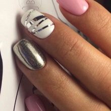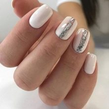 - With ribbons. Snow-white manicure is considered incredibly beautiful and fashionable, complemented by neat ribbons of golden or silver color. Such parts are sold in many online stores. Usually, several such strips are glued to snow-white nails, and then the result is fixed with a coating of transparent varnish. So the strips hold more reliable and longer, and also acquire the necessary shine. This manicure looks very stylish and modern, so today many fashionistas choose it.
