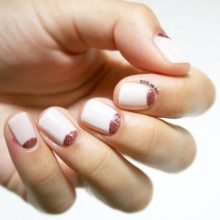 - Lunar. Recently, so-called lunar manicure has been very popular. This design involves staining the lunula of the marigold. If you turn to this fashionable design on short nail plates, you can create a very original manicure. It is recommended to do it using a suitable stencil: he will very carefully select the crescent from the rest of the base.