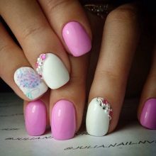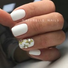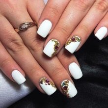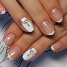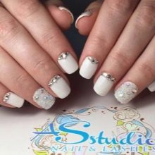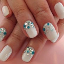 - With rhinestones. Fresh and original on the ladies' nails looks snow-white varnish, complemented by large shining rhinestones. This design has gained popularity relatively recently, but has already managed to get wide distribution. In addition to rhinestones, elements of faux jewelry or small pebbles may be present on short nails.But you need to be careful with such inclusions. On nails of small length, they should not be in excess so as not to aggravate the manicure.