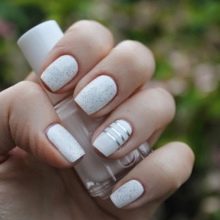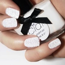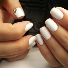 - Often when applying white varnish on the nails, small surface irregularities or noticeable defects are formed. You should not be afraid of such problems, but you need to fight them. A clear glitter varnish may help. It just needs to be applied in a single layer on a white coating, and then dried thoroughly. Under the transparent layer, all the irregularities of the white varnish will be almost invisible, and the sparkles will make the manicure more “lively” and attractive.