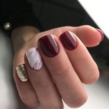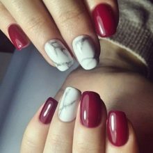 - white-burgundy - feminine and noble manicure, which can be either glossy or matte (looks impressive with additional decorations: pebbles or stickers).