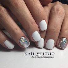 - Matt White manicure with a matte texture - a fashionable and modern version of the design of marigolds. Matte varnish can be combined with glossy coatings, patterns, patterns, rhinestones or shiny stripes. The result is an original and effective design, emphasizing the delicate taste of its owner.