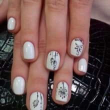 - With drawings. White varnish is the perfect background. A variety of drawings and patterns look bright and expressive on it. Usually the latter are applied using a special thin brush or a special stencil. The color scheme of the drawings can be different: from delicate to sharply contrasting and dark.