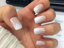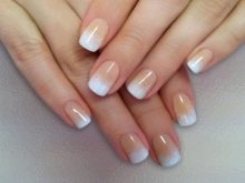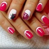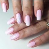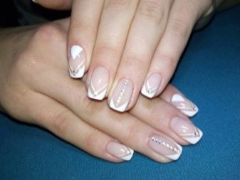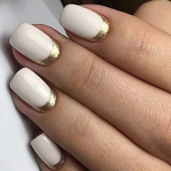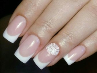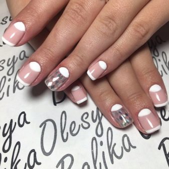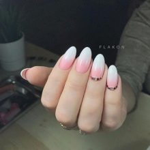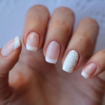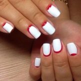 It depends on imagination how stylishly a plain plain manicure will be decorated. The transition from the main color to the jacket is made out by a beautifully decorative element, you can use foil or a pattern in the form of lace. Since the white color is “difficult” to apply, several layers have to be made, so it will take a long time until it dries. Perfectly he lays down only on a perfectly polished nail. Apply varnish without affecting the cuticle, slightly not reaching the edges, so as not to smear the skin. Erasing then the coating there will be difficult without lubricating it on the nail.