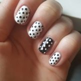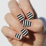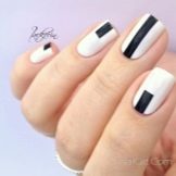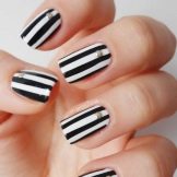 The classic combination of white and black stripes always looks appropriate on the nails. With peas, the manicure is interesting. These two contrasting colors are perfect for the office style, because they look concise and strict. The mirror surface looks very good on nails, especially when a jacket is formed in this version. It is unusual, fashionable and modern.