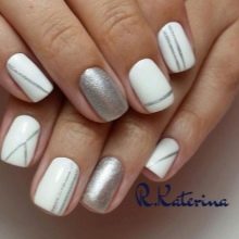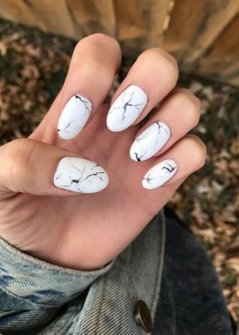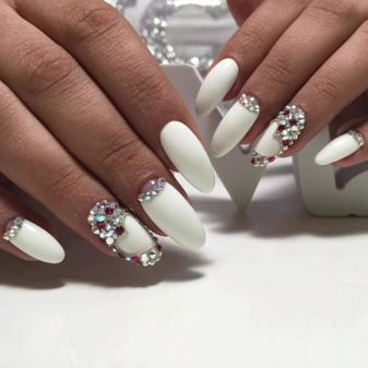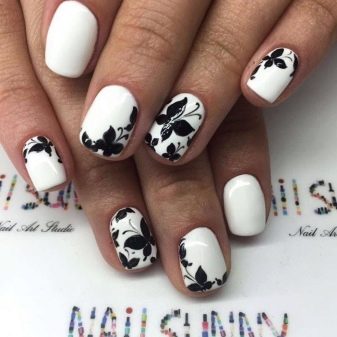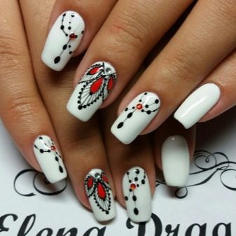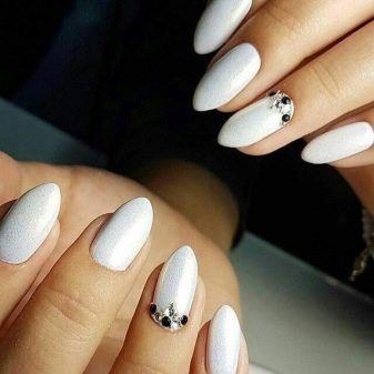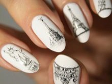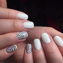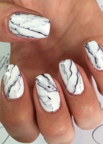 No less interesting will be nail art; shiny sand and Swarovski crystals do not go out of fashion. On white gel polish today, more and more women choose inlay, which allows to achieve the desired contrast.Drawings with a hair brush are quick and easy, but the master must act confidently. White marble manicure is something simply unimaginable, a special technology for creating it on nails has been developed. To do this, the nail plate is coated with white varnish, and separately on the foil the black coating is mixed with white, then applied with a thin brush. The veins flow neatly, each time creating a unique pattern. Creating the same pattern twice will fail.