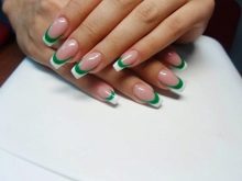 Vertical jacket has gained new popularity among women when the strip goes all over the nail. You can supplement the transition line with a decorative element, for example, a pattern or rhinestones. Speaking specifically about French manicure, the length of the nail does not matter. This decor always looks harmonious, no matter the woman has an oval shape on her hands, square or pointed.