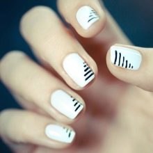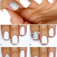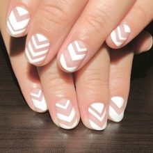 For the design, a high-quality thin brush is used, it is better if it is synthetic. The lines are arranged in any desired direction. Their thickness is also adjustable. You can experiment with color, use classic black, or add color accents. White and pink look very good, and as a main tone it is advisable to use matte white.