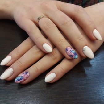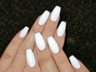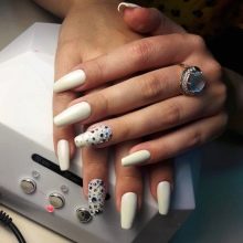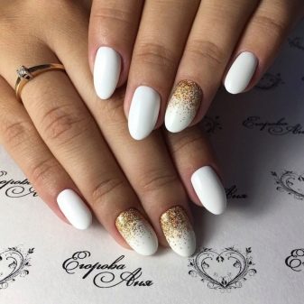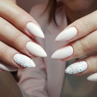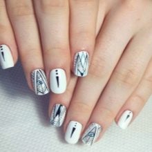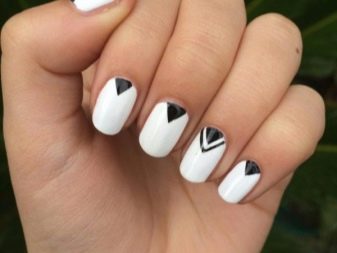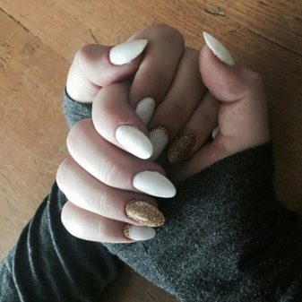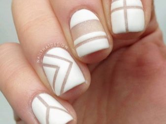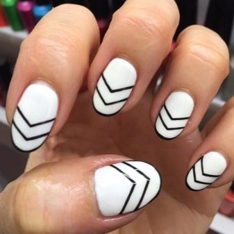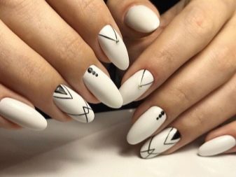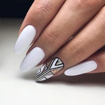 With a pointed shape, geometric shapes will be the best option for drawing. Triangles, broken lines look modern. Even if it is a monochrome manicure, he will not be left without attention. Recently, a matte shade has become increasingly popular, which is distinguished by the freshness of the idea, but it does not fit every length and shape. On short nails, it looks bad, especially if a woman has a wide nail plate, it is better if it is a narrow shape and nails of medium length. Women in age should also abandon this design idea, since white color will only emphasize changes in skin color.