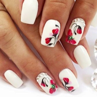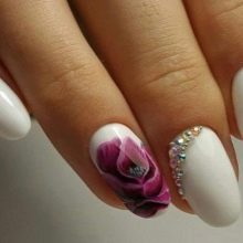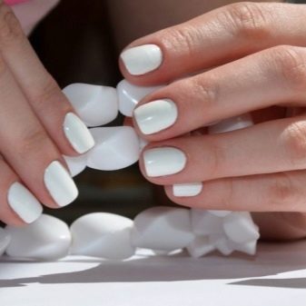 If a girl likes white, you can use shellac for manicure, which, in addition to beauty, also has increased strength. If applied correctly, it will last for several weeks. It is a wonderful basis for creating a moon or French manicure, goes well with any style of clothing. It looks perfect with animal print, abstraction, images of flowers. In winter, pale blue snowflakes can be depicted on it, and in the summer and spring - gentle lilies of the valley.