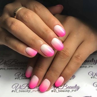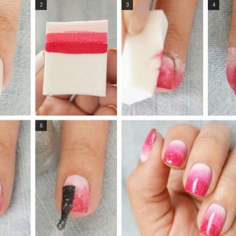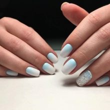 When creating an ombre, the white color dissolves in a different shade. The blurry border looks very modern. To mix the shades, use a small piece of foam. Rub the face until both varnishes are dry. A clear varnish can be applied on top.